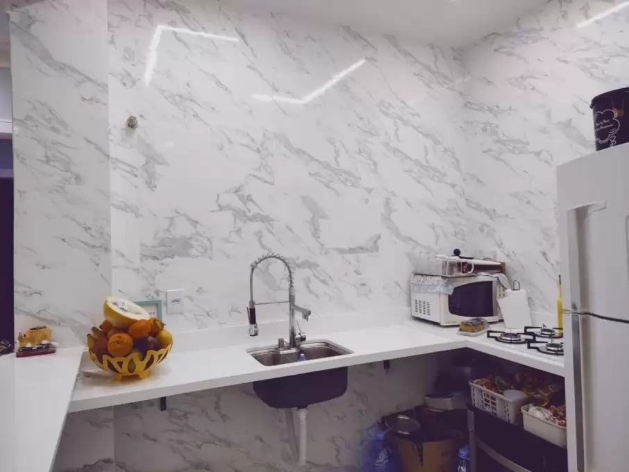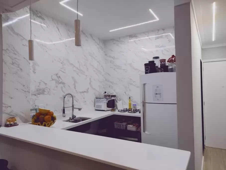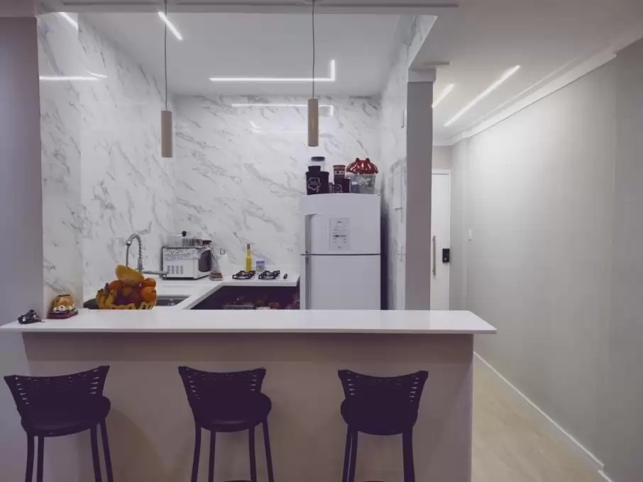 A cozinha, integrada à sala, apresenta pedra Quartzo Branco e porcelanato, com um layout pensado para destacar o ambiente.